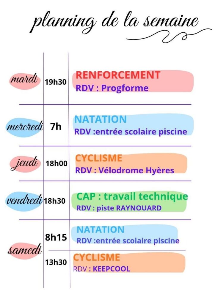 A noter : la possibilité de réaliser des entrainements sr la piste de cyclisme au vélodrome de Hyères le jeudi soir ! Entrainement proposé par la roue d’or (Brignoles).